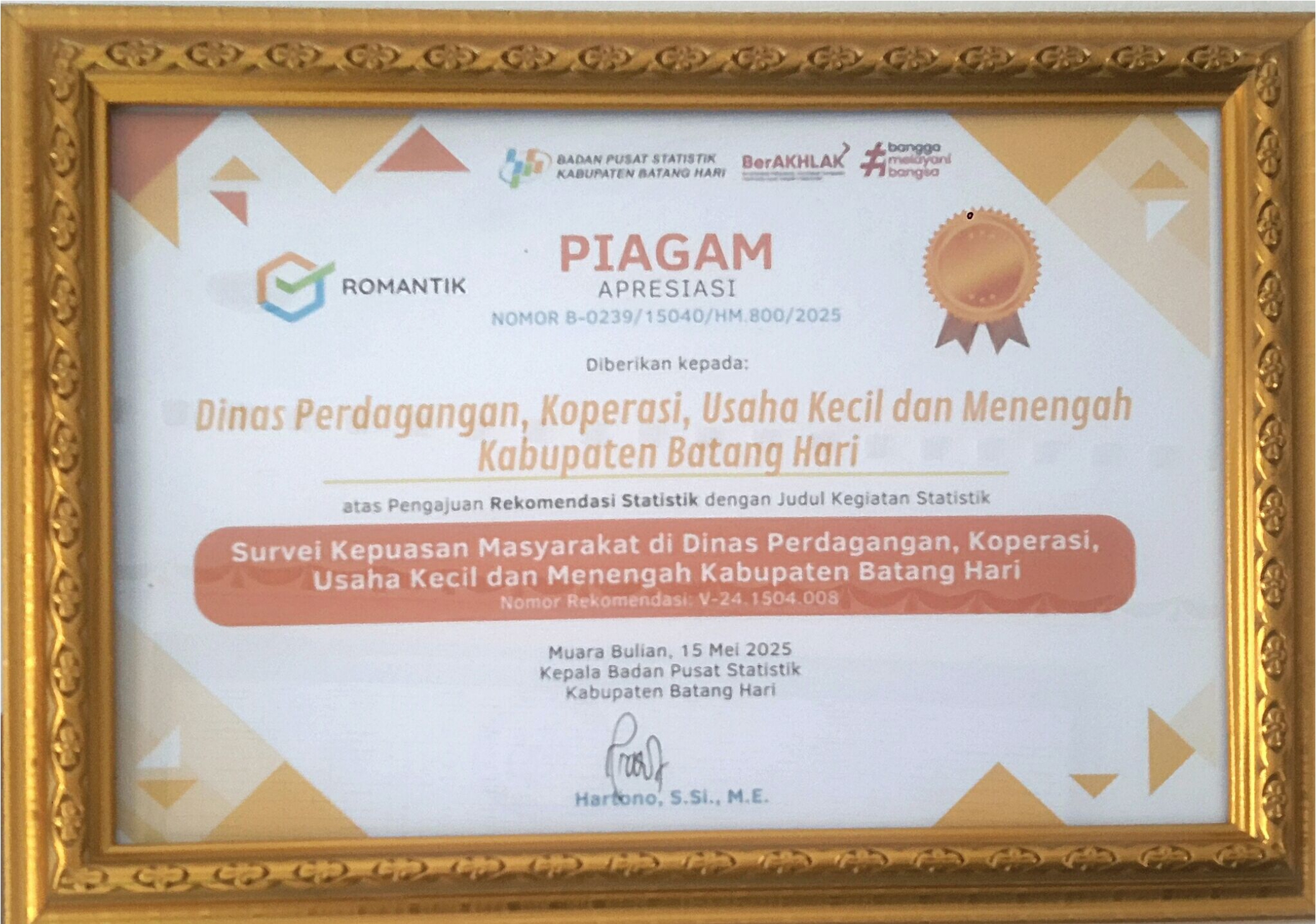 Piagam ini diberikan sebagai pengakuan atas peran Dinas Perindagkop sebagai...