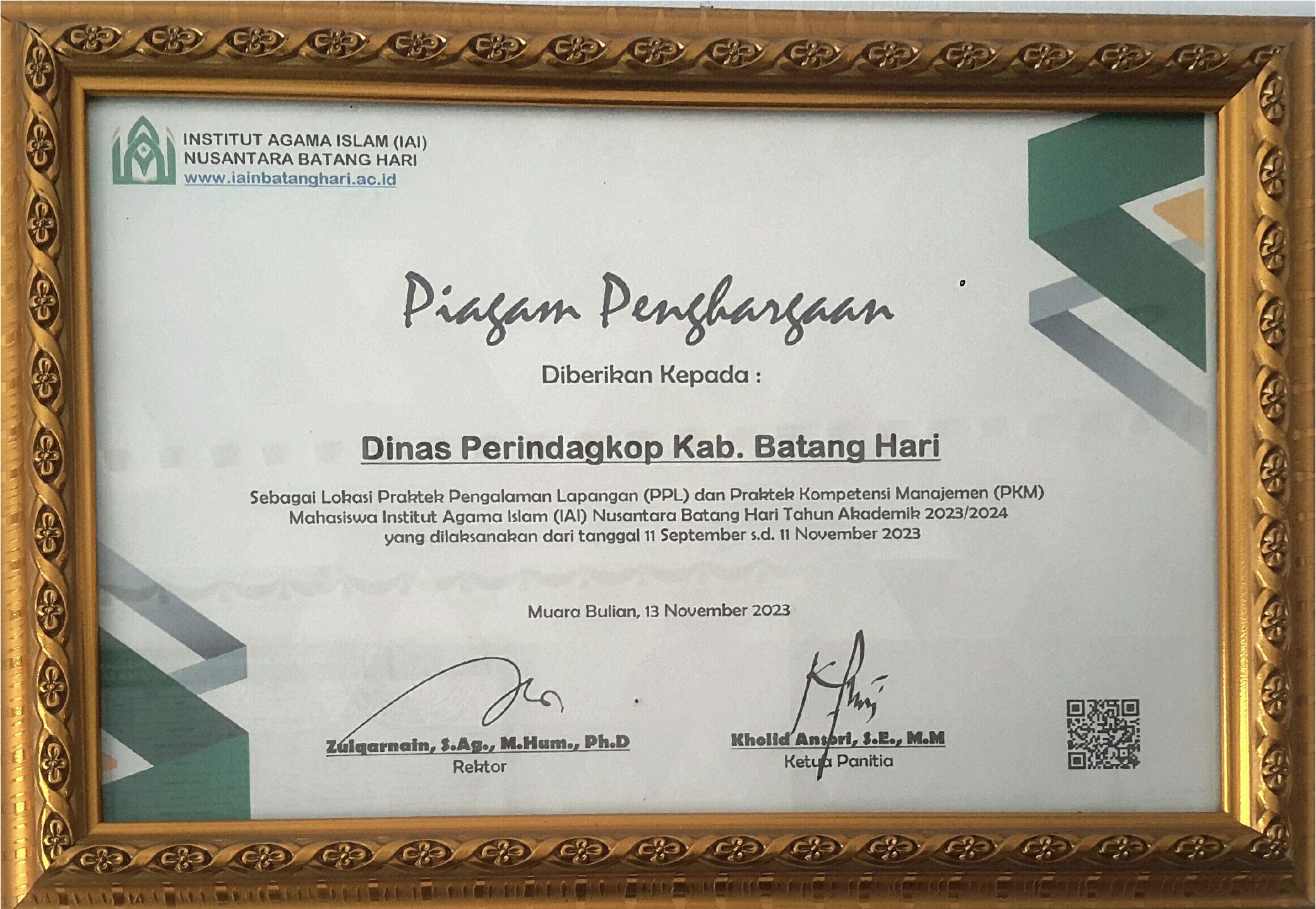 Piagam Penghargaan dari Institut Agama Islam Nusantara Batang Hari...